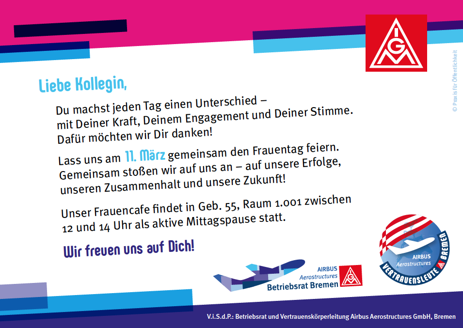 Zum Frauentag 2025 gestalteten wir für den Betriebsrat von Airbus Aerostructures Bremen eine Postkarte. Passend zum Corporate Design mit von uns gestalteten Logos.
